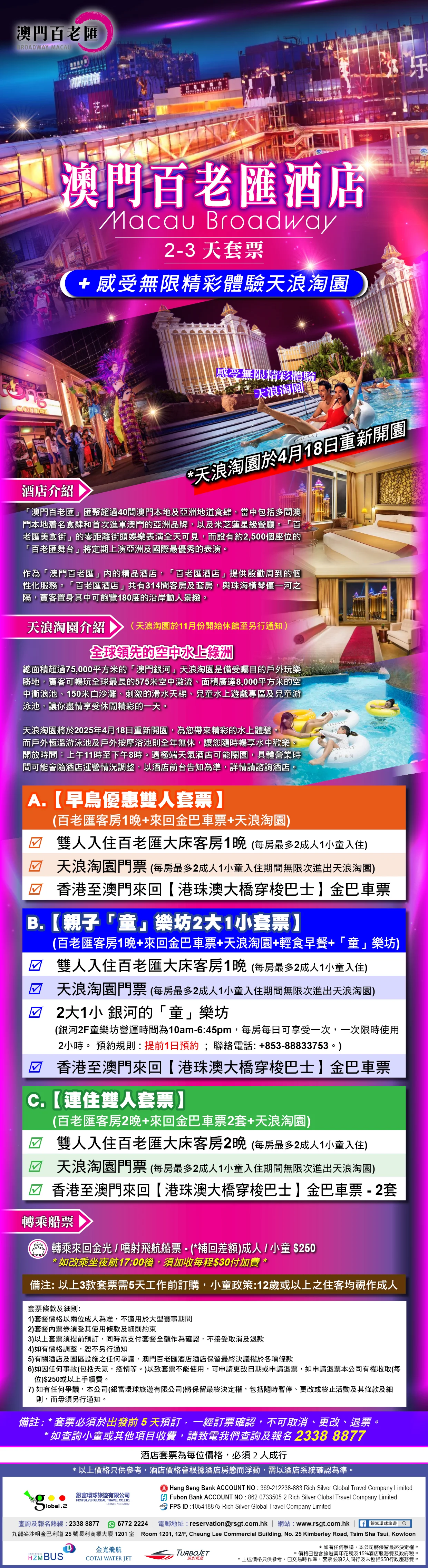 澳門百老匯酒店2/3天套票+感受無限精彩體驗天浪淘園 簡介