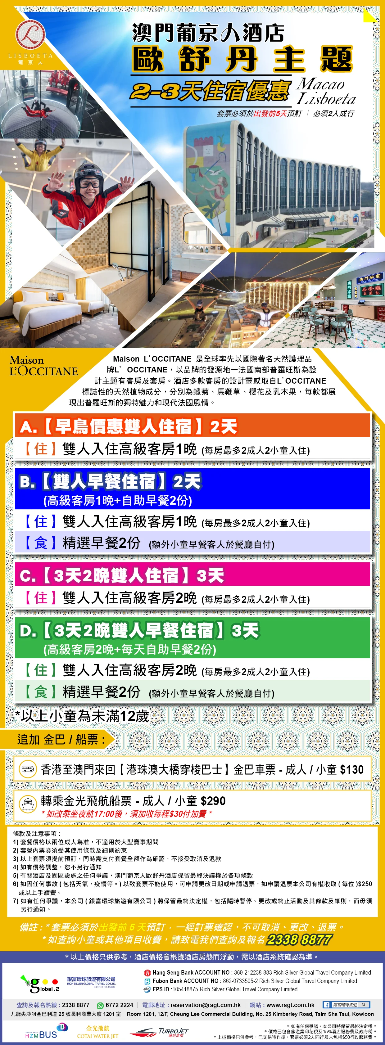 澳門葡京人歐舒丹酒店住宿 2/3天套票