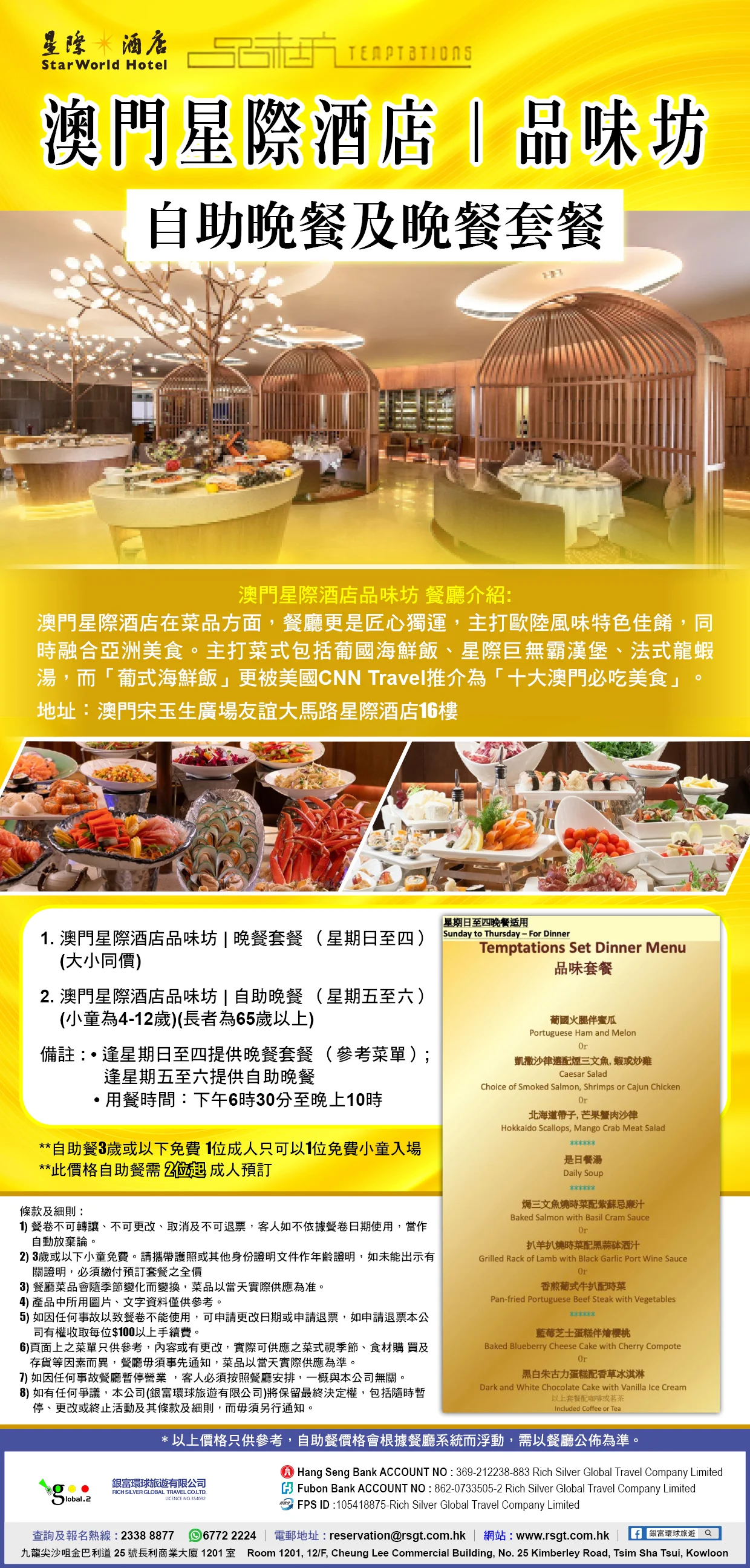 澳門星際酒店品味坊自助晚餐及晚餐套餐