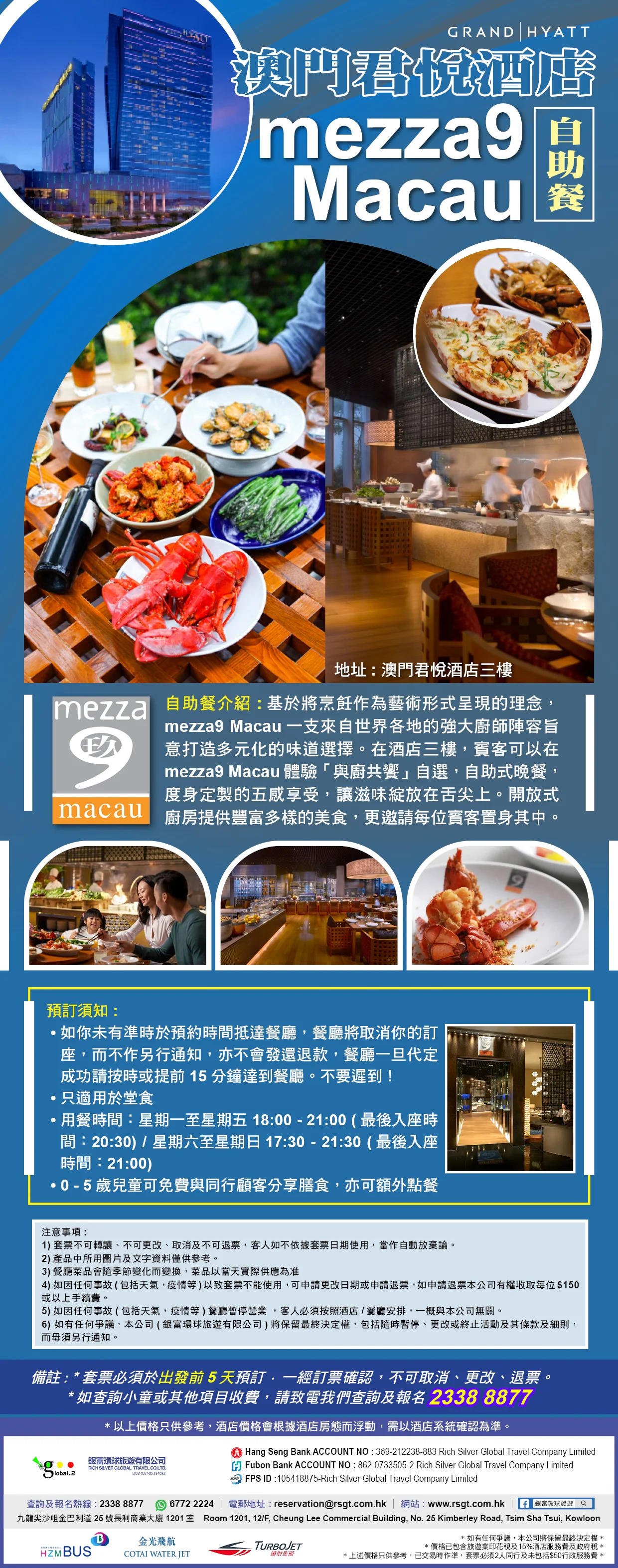澳門Mezza9 Macau 自助餐 - 澳門君悅酒店 基於將烹飪作為藝術形式呈現的理念,mezza9 Macau一支來自世界各地的強大廚師陣容旨意打造多元化的味道選擇。 在飯店三樓,賓客可在mezza9 Macau體驗「與廚共颯」自選,自助式晚餐,度身訂製的五感享受,讓滋味綻放在舌尖上。開放式廚房提供豐富多元的美食,更邀請每位賓客置身其中 自助晚餐 用餐時間:週一至星期五18:00 - 21:00 (最後入座時間:20:30) / 週六至星期日17:30 - 21:30 (最後入座時間:21:00)