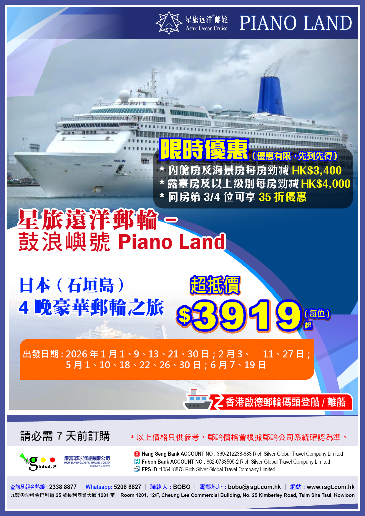 星旅遠洋 | 鼓浪嶼號 (PIANO LAND) 4晚日本(石垣島)郵輪船票 * 出發日期:2026年1月1、9、13、21、30日;2月3、11、27日 5月1、10、18、22、26、30日;6月7、19日 香港啟德郵輪碼頭登船及離船】查詢/預訂Whatsapp : 52088827 聯絡人 :BOBO
