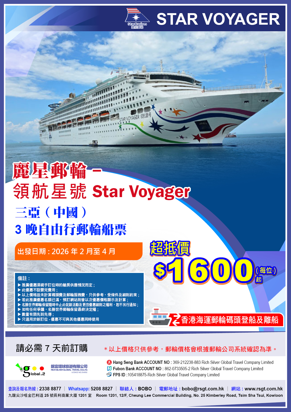 麗星郵輪~ 領航星號 (Star Voyager)2026年2至4月航程 3晚三亞(中國)郵輪船票 【香港海運郵輪碼頭登船及離船】 出發日期: 2026年2月15、22日; 3月1、15、22、29日;4月12、19、26日 預訂查詢 Whatsapp : 52088827