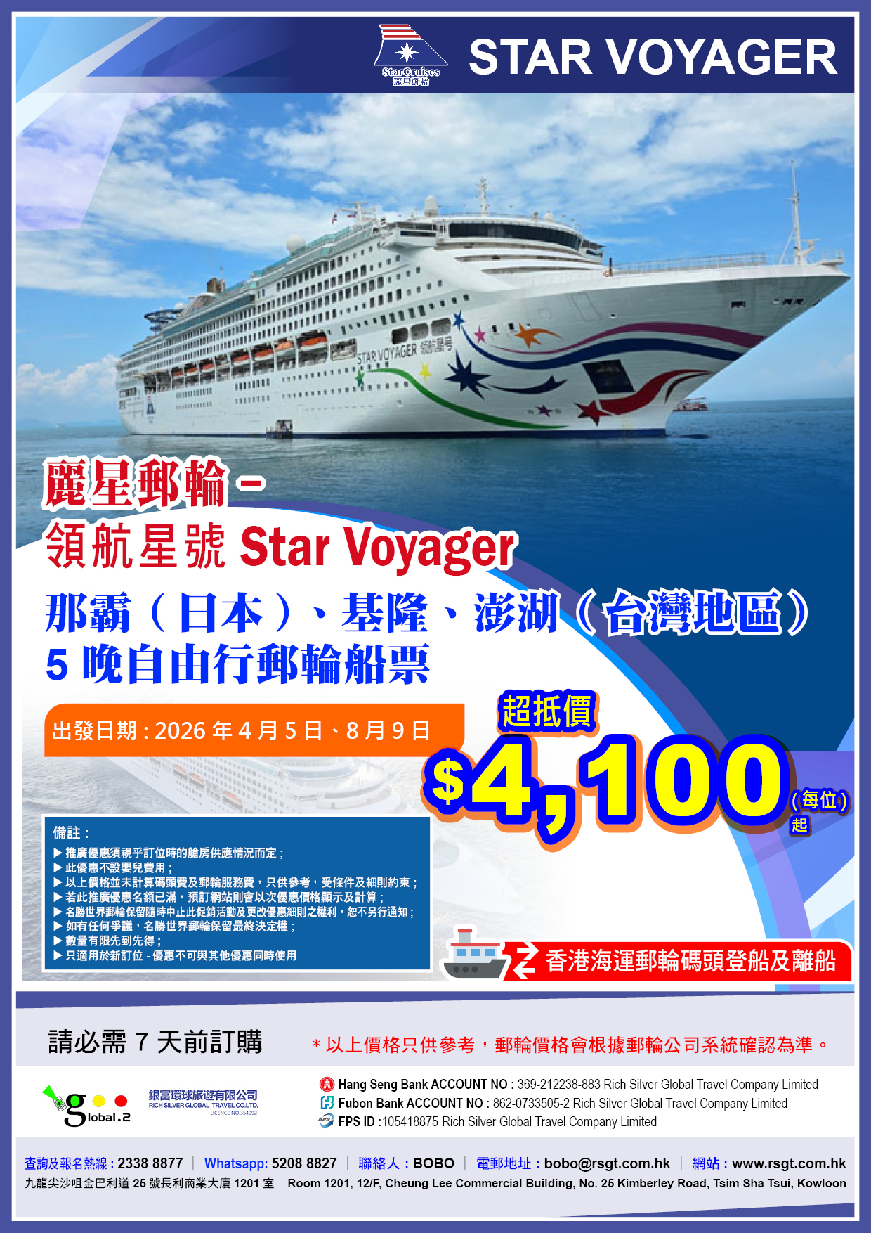 麗星郵輪 | 領航星號 (Star Voyager)2026年2至11月航程 5晚那霸(日本) 、基隆、澎湖(台灣地區)郵輪船票 【香港海運郵輪碼頭登船及離船】 出發日期:2026年4月5日、8月9日 預訂查詢 Whatsapp : 52088827 聯絡人 :BOBO