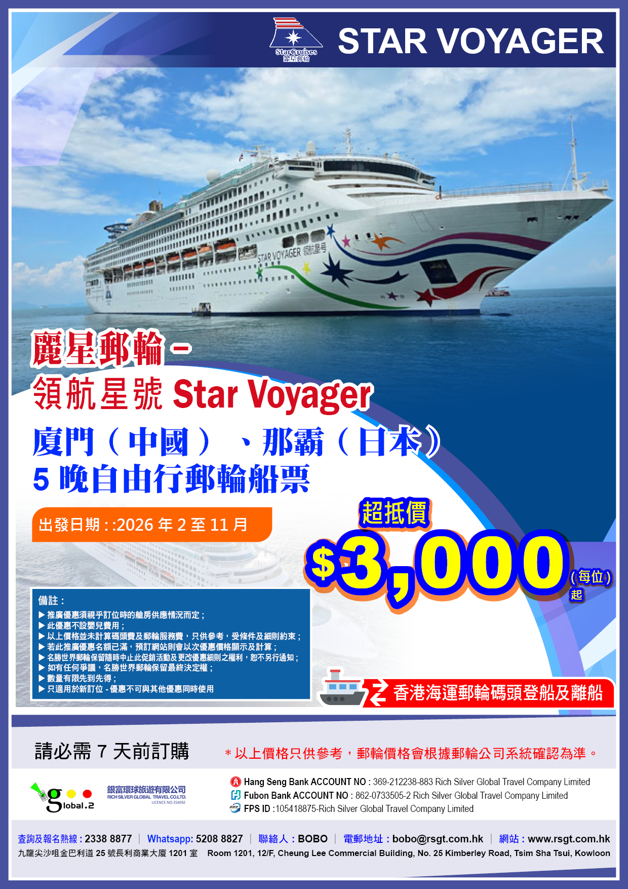麗星郵輪 | 領航星號 (Star Voyager)2026年2至11月航程 5晚廈門(中國) 、那霸(日本)郵輪船票 【香港海運郵輪碼頭登船及離船】 出發日期:2026年2至11月 查詢/預訂Whatsapp : 52088827 聯絡人 :BOBO