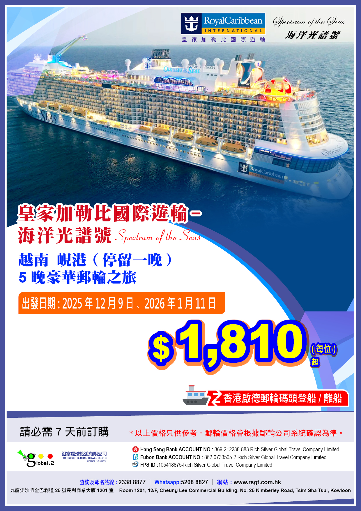 皇家加勒比 | 海洋光譜號郵輪 越南之旅出發日期 : 2025 年 12 月 9日 ,2026年1月11日 查詢及預訂Whatsapp : 52088827