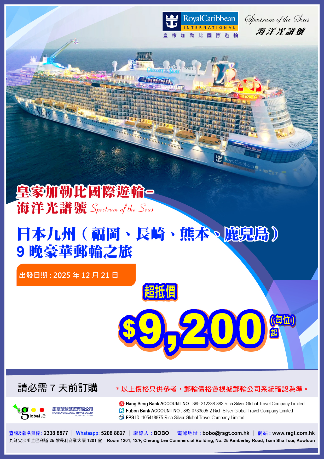 皇家加勒比 | 海洋光譜號郵輪 9晚日本九州之旅 出發日期 : 2025 年 12 月 21 日 查詢及預訂Whatsapp : 52088827 聯絡人 :BOBO