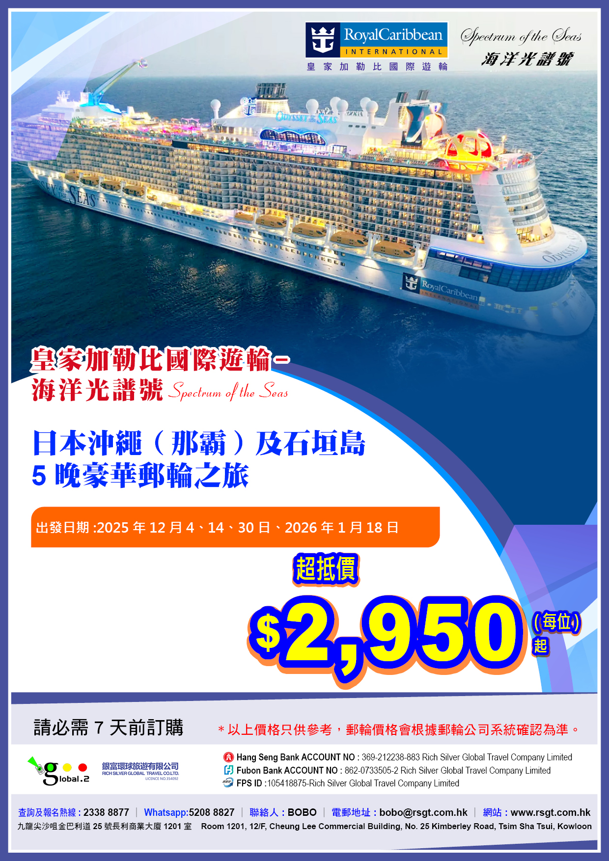 皇家加勒比 | 海洋光譜號郵輪 日本 5晚 沖繩及石垣島之旅 出發日期:2025年12月4、14、30日、2026年1月18日 預訂/查詢Whatsapp : 52088827 聯絡人 :BOBO