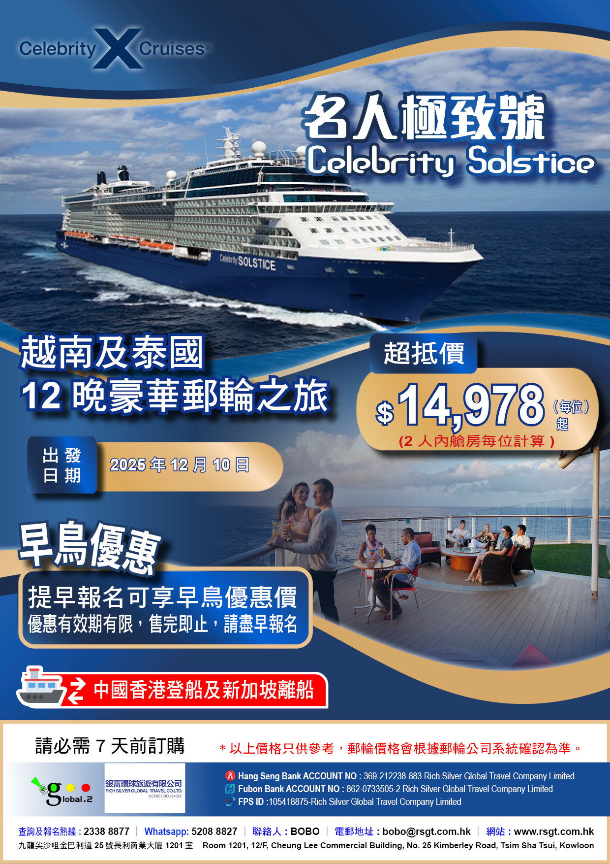 名人極致號〈Celebrity Solstice〉 12晚 越南及泰國之旅郵輪船票 [香港登船、新加坡離船] 出發日期: 2025年12月10日 查詢/預訂Whatsapp : 52088827 聯絡人 :BOBO