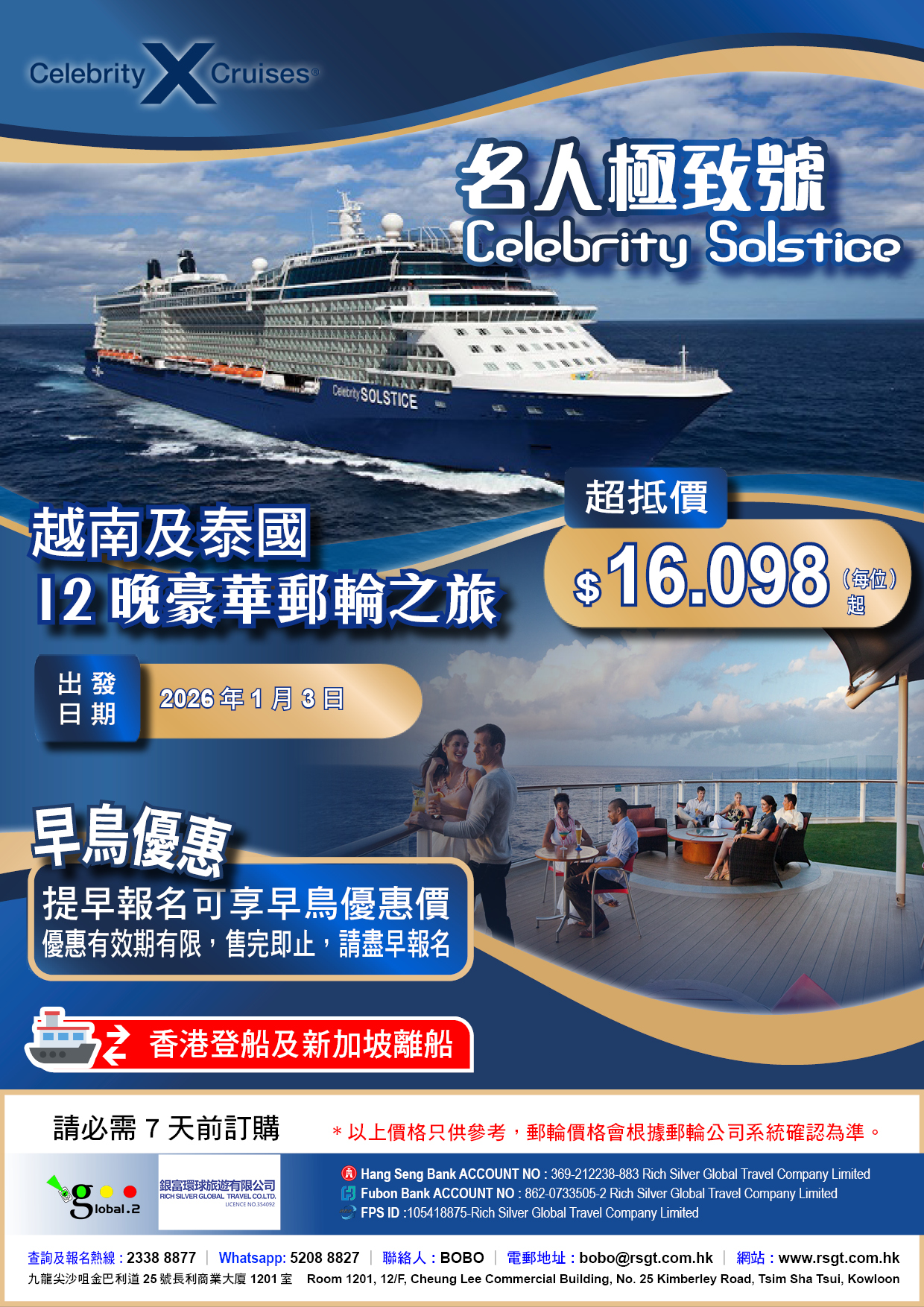 名人極致號〈Celebrity Solstice〉 12晚 越南及泰國之旅郵輪船票 [香港登船、新加坡離船] 出發日期: 2026年1月3日 查詢/預訂Whatsapp : 52088827 聯絡人 :BOBO