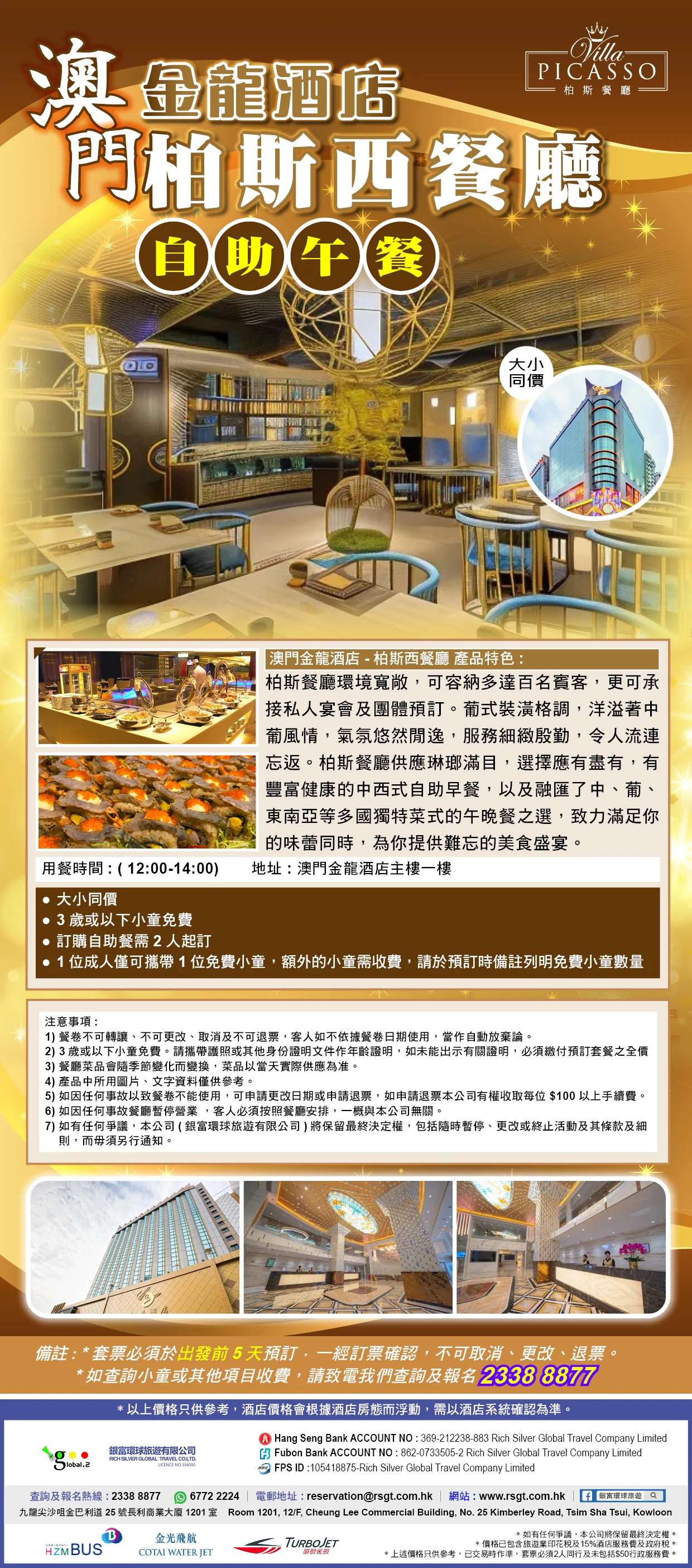 | 金龍酒店柏斯自助午餐12:00-14:00 (大小同價) 每位 | $ |