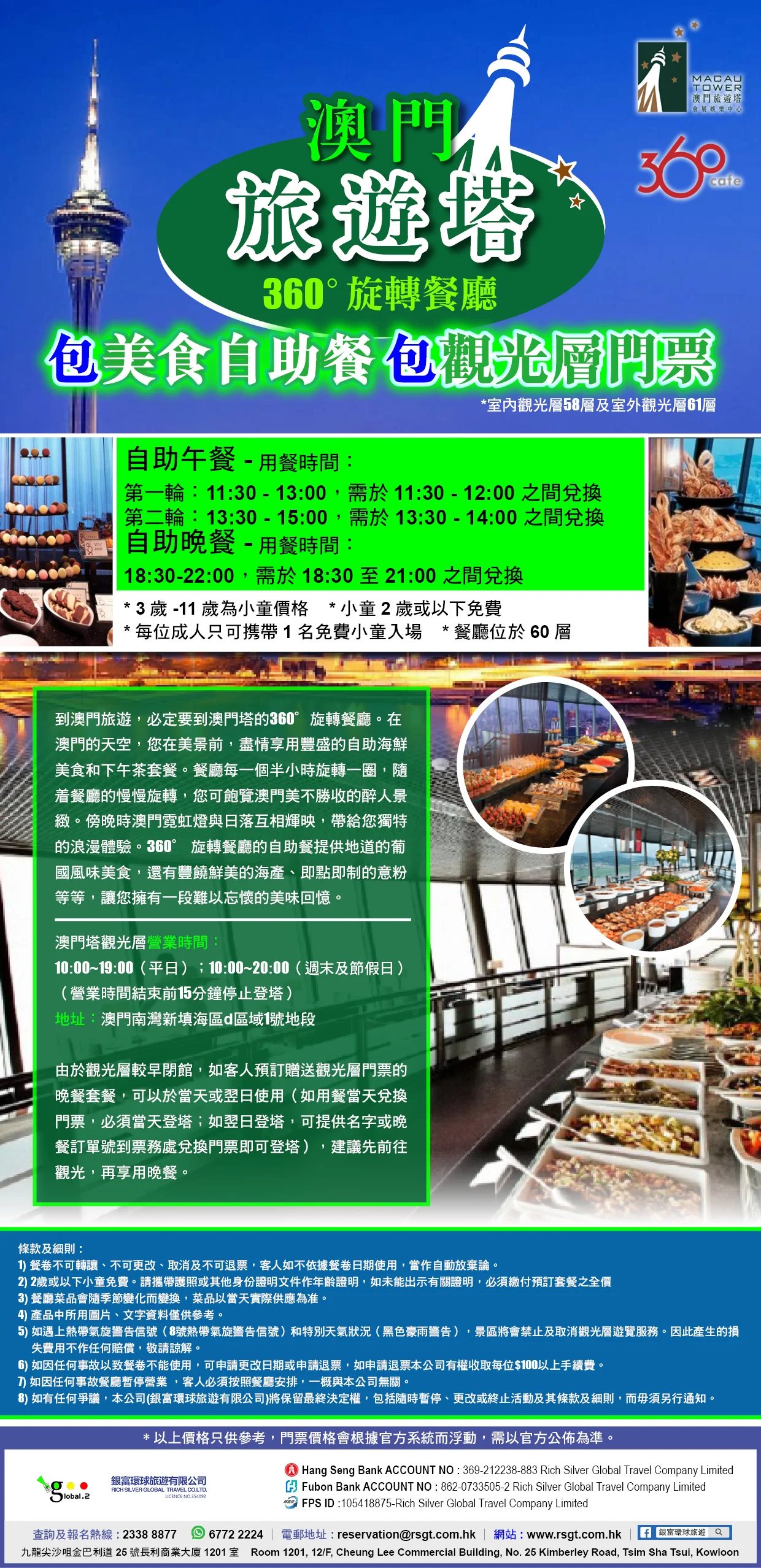 澳門旅遊塔360旋轉餐廳自助餐包觀光層門票 簡介
