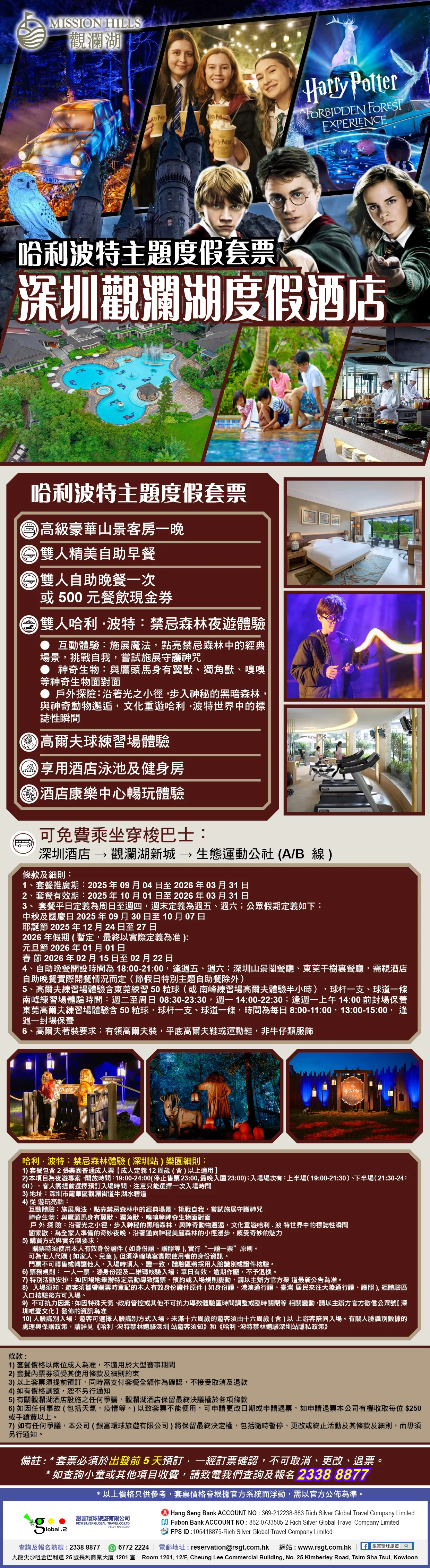 $865起 (每位)~魔法之旅限時啟程!深圳觀瀾湖+哈利波特禁忌森林體驗2天套票優惠