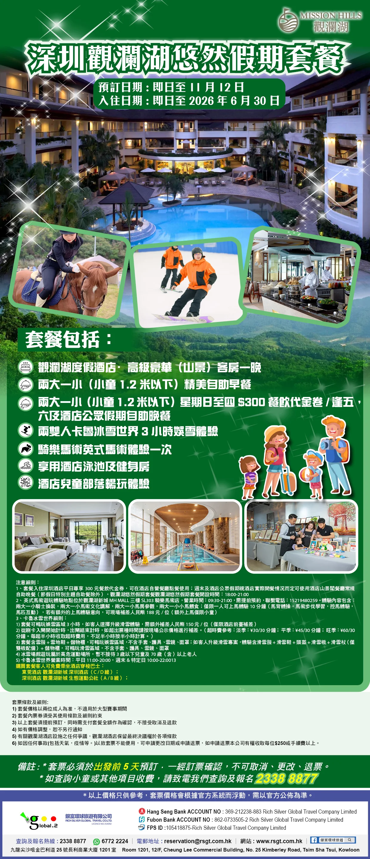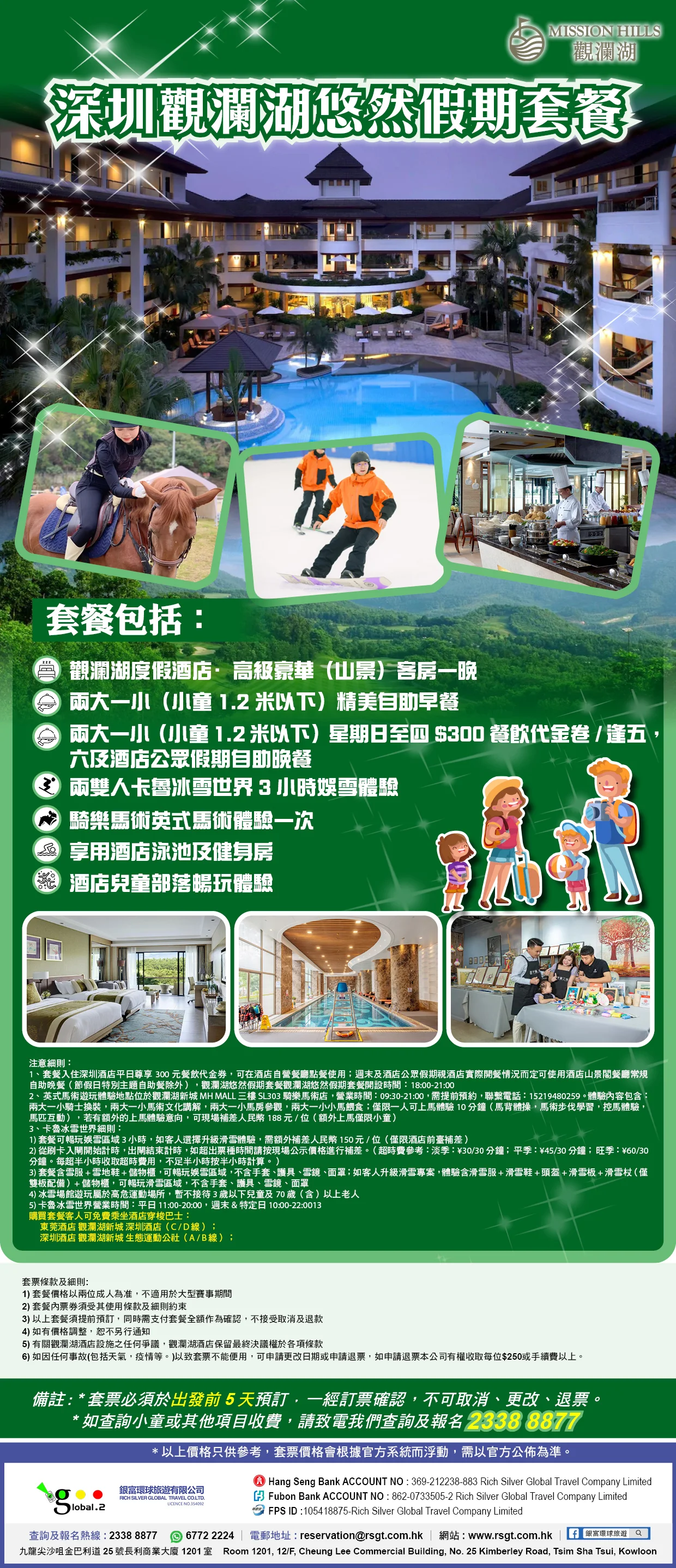 | A)高級豪華(山景)客房1晚+首天入住當日自助晚餐2位成人及1位小童(小童身高1.2米以下)+入住翌日自助早餐2位成人及1位小童(小童身高為1.2米以下)+卡魯冰雪世界3小時娛雪體駭門票2張+騎樂馬術英式馬術體驗2位成人及1位小童(小童身高為1.2米以下) | ||
