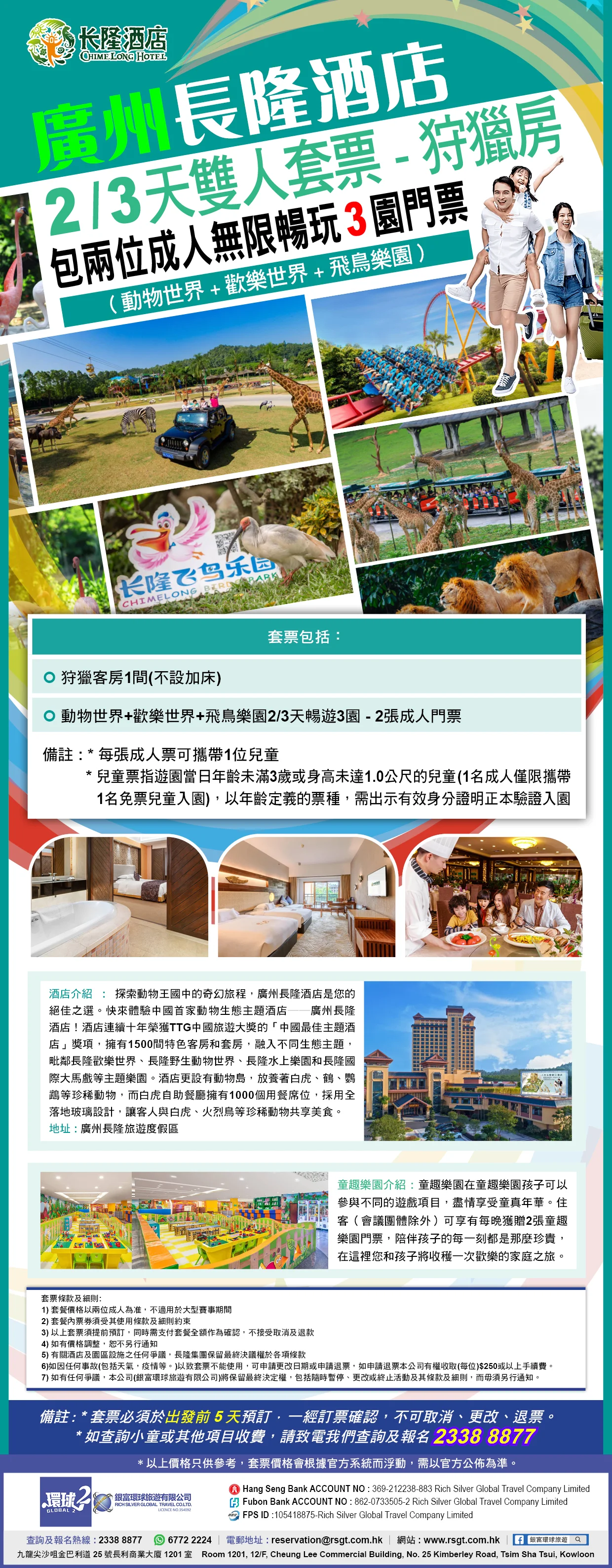 廣州長隆酒店【2/3天雙人套票】狩獵房(包2位無限暢玩3園-動物世界+歡樂世界+飛鳥樂園)+限時贈送2張水上樂園門票