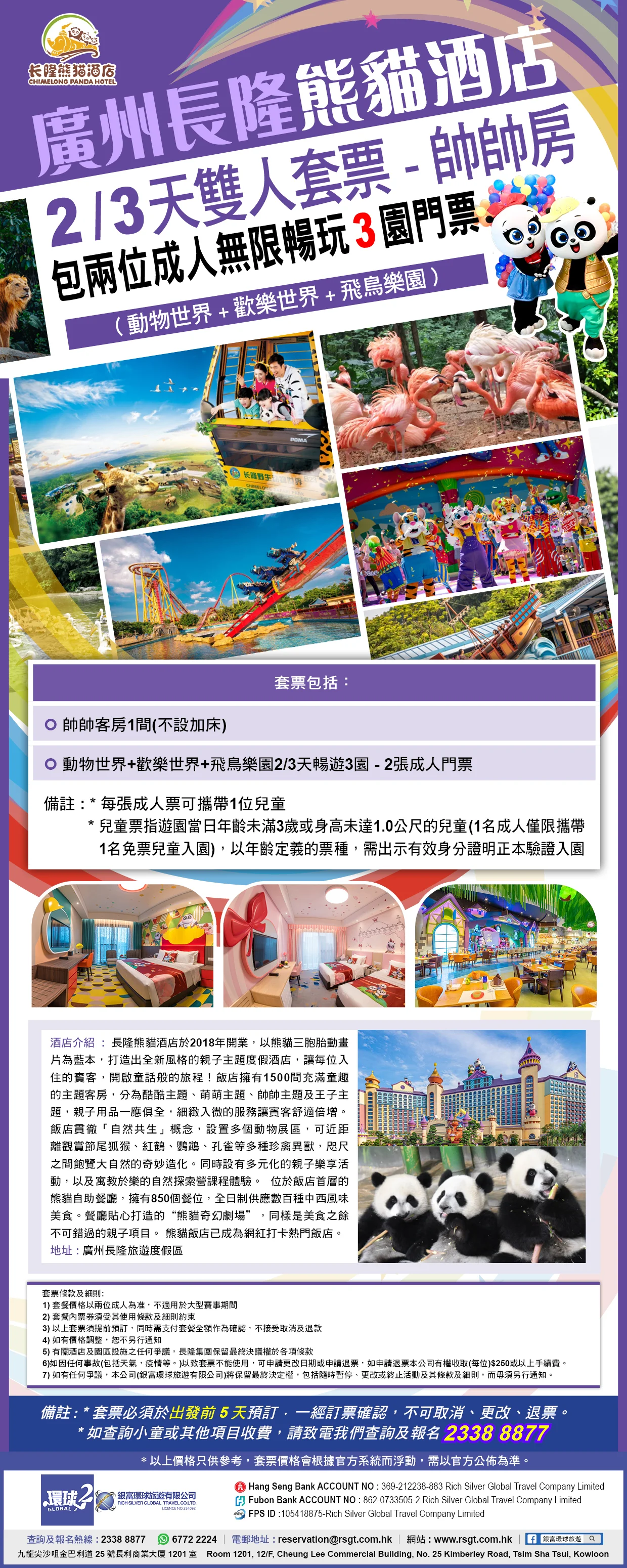 廣州長隆熊貓酒店【2/3天雙人套餐】帥帥房(包2位無限暢玩3園-動物世界+歡樂世界+飛鳥樂園)