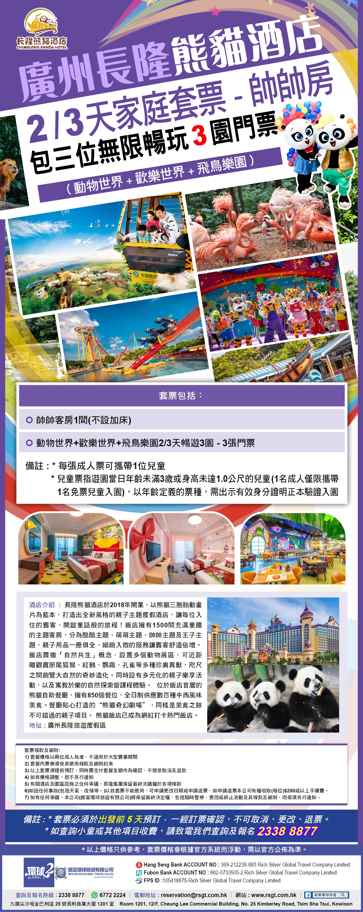 廣州長隆熊貓酒店【2/3天家庭套餐】帥帥房(包3位無限暢玩3園-動物世界+歡樂世界+飛鳥樂園)+限時贈送2張水上樂園門票
