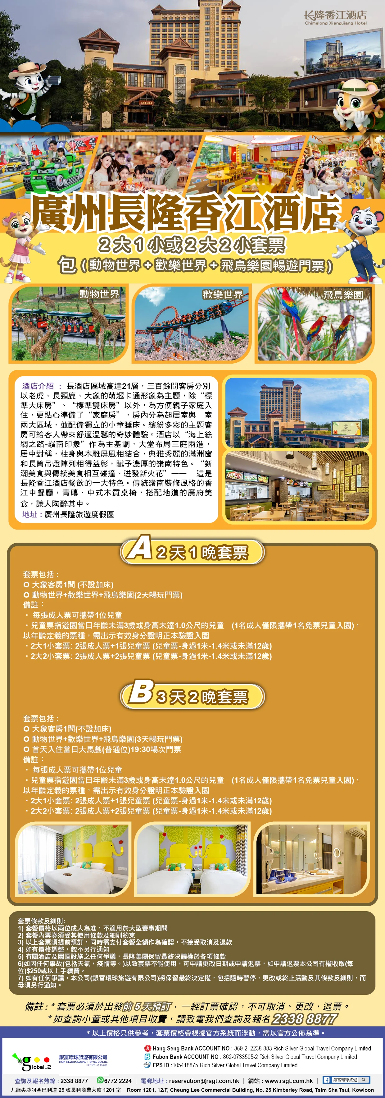 自由行套票網上預訂廣州長隆香江酒店【2/3天2大1小或2大2小套票】大象房(無限暢玩3園-動物世界+歡樂世界+飛鳥樂園/大馬戲)