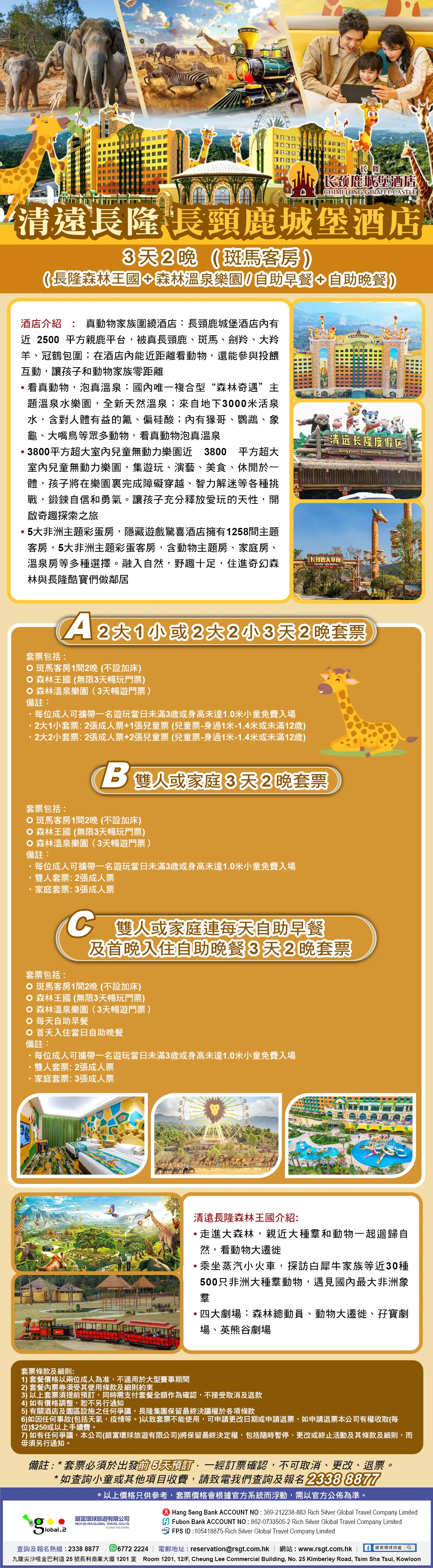 F)家庭套票: 班馬客房2晚+森林王國3天暢遊門票3張成人票+森林溫泉樂園3天暢遊門票3張成人票+每天自助早餐3份+首天入住當日自助晚餐3份 | ||